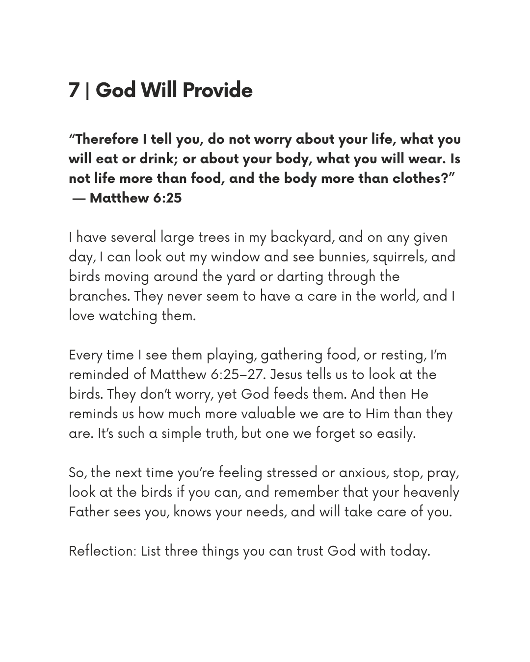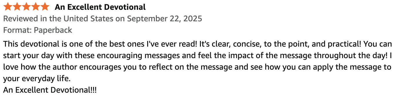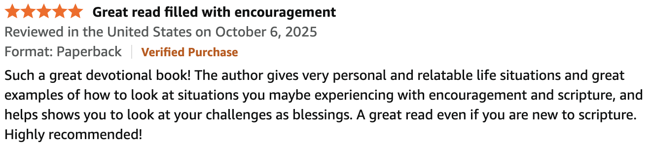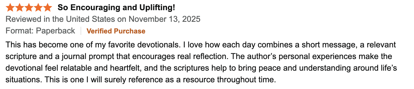 Life can be challenging at times, but there are still so many things to be joyful about. I’ve experienced some challenging and anxiety-ridden times in my life, but through it all, God has sustained me and given me the strength to keep going! In this devotional, I share encouraging scriptures, relatable stories, and reflections with a space for journaling at the back. I pray that this devotional will encourage you to persevere through challenges, find joy in the everyday, and trust God through it all.