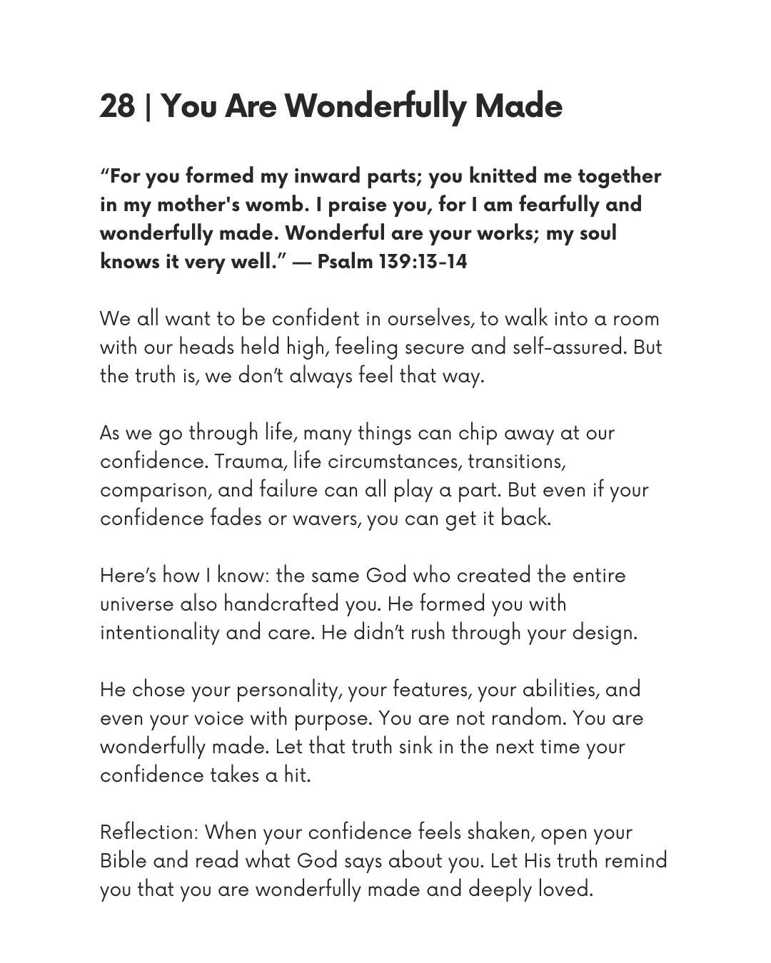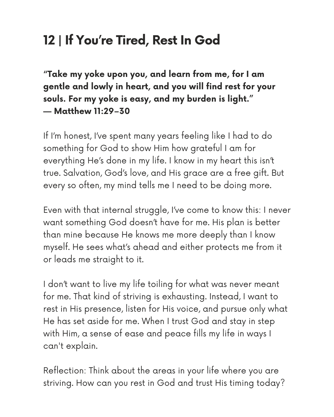 In this devotional, I share encouraging scriptures, relatable personal stories and experiences, and reflections that I pray will encourage you to persevere through life’s challenges, find joy in the everyday, and trust God through it all.