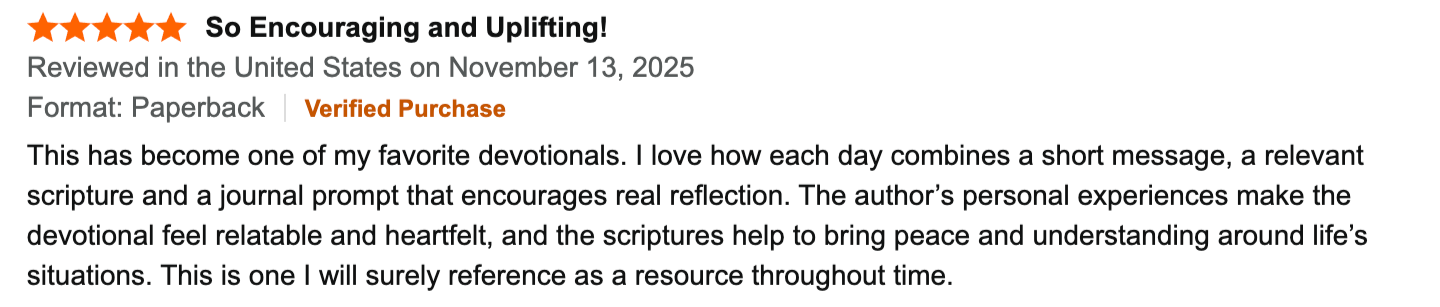 In this devotional, I share encouraging scriptures, relatable stories, and reflections that I pray will encourage you to persevere through life’s challenges, find joy in the everyday, and trust God through it all.